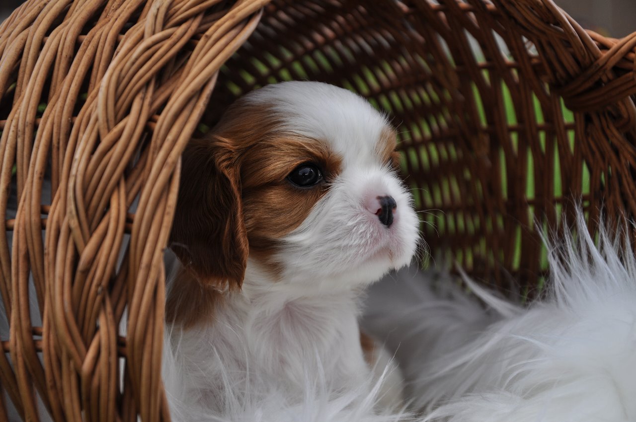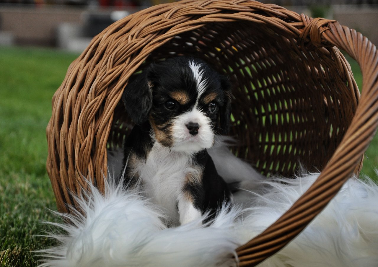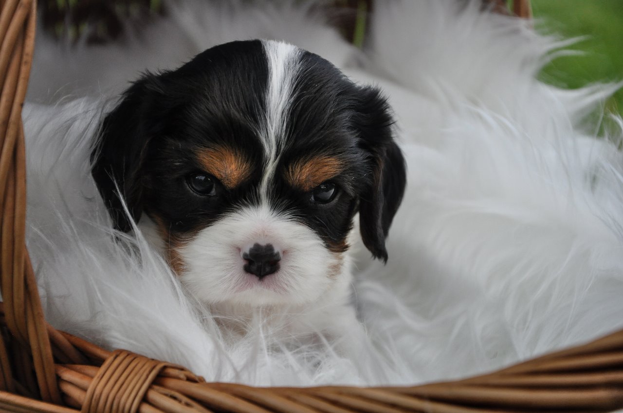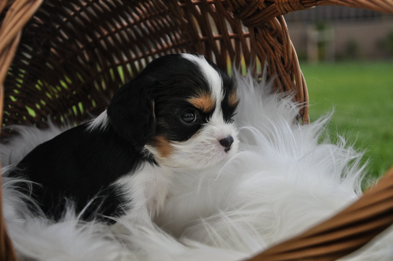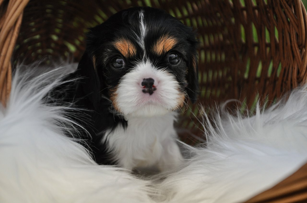 Tři trikolorní fenečky a tři kluci. Dva v trikolorním kožíšku a jeden blenheim pejsek.
